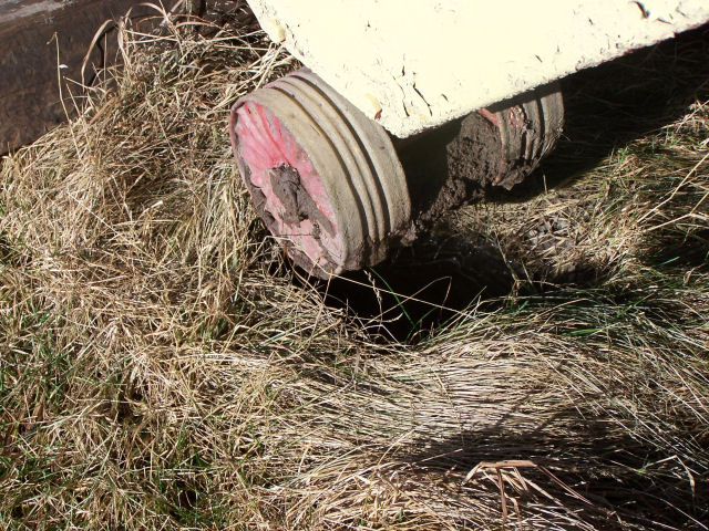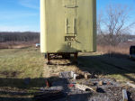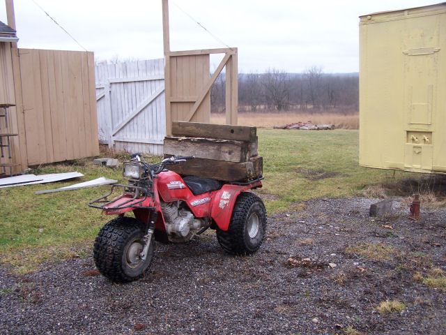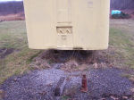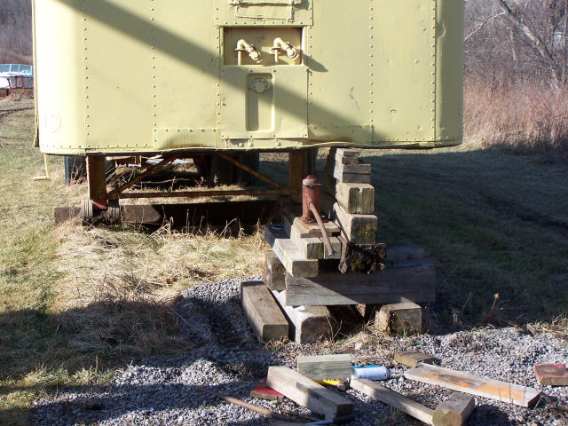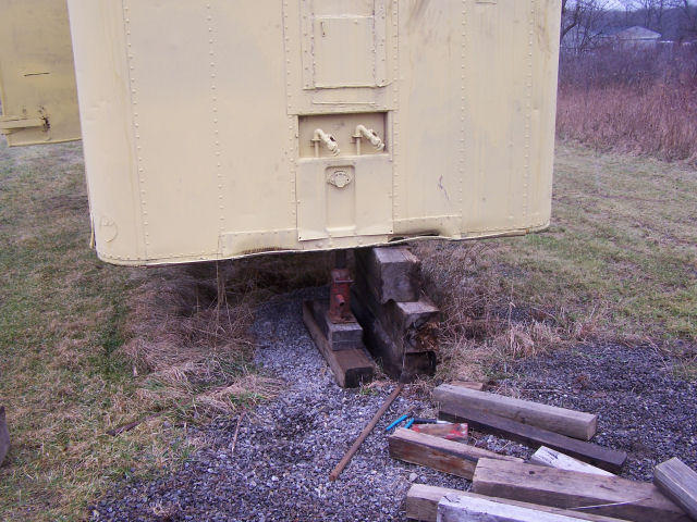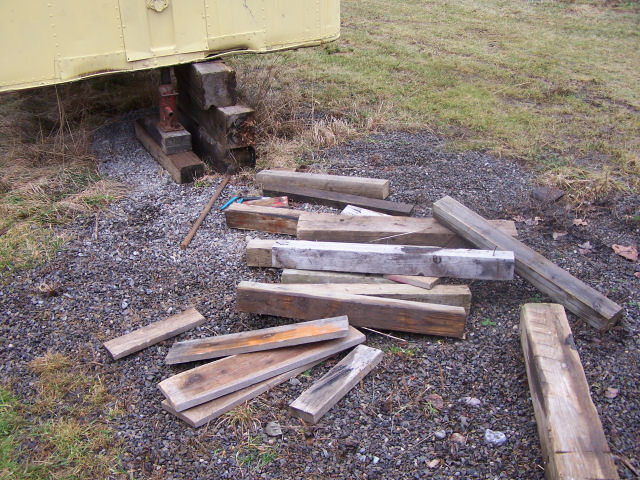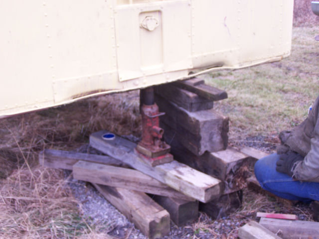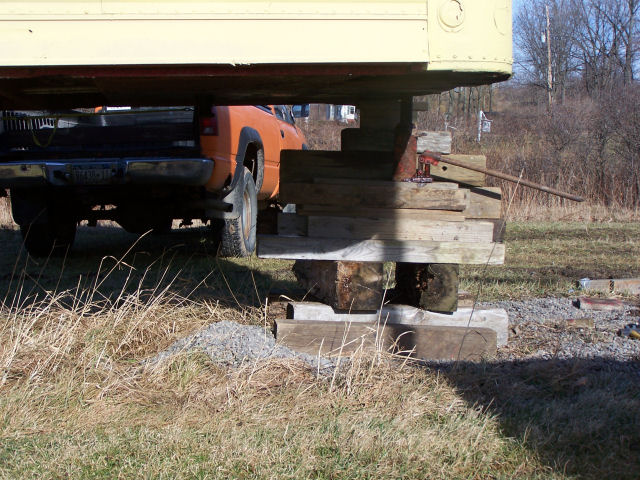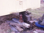 Jacking the trailer up out of the mud! Trailer sank into the mud due the loading of oak lumber into the front and the ground has not frozen yet this winter. Used a 20-ton jack and loads of blocking to lift. Jacked about 12 times to get the total lift. This page was last updated on 01/23/06. |